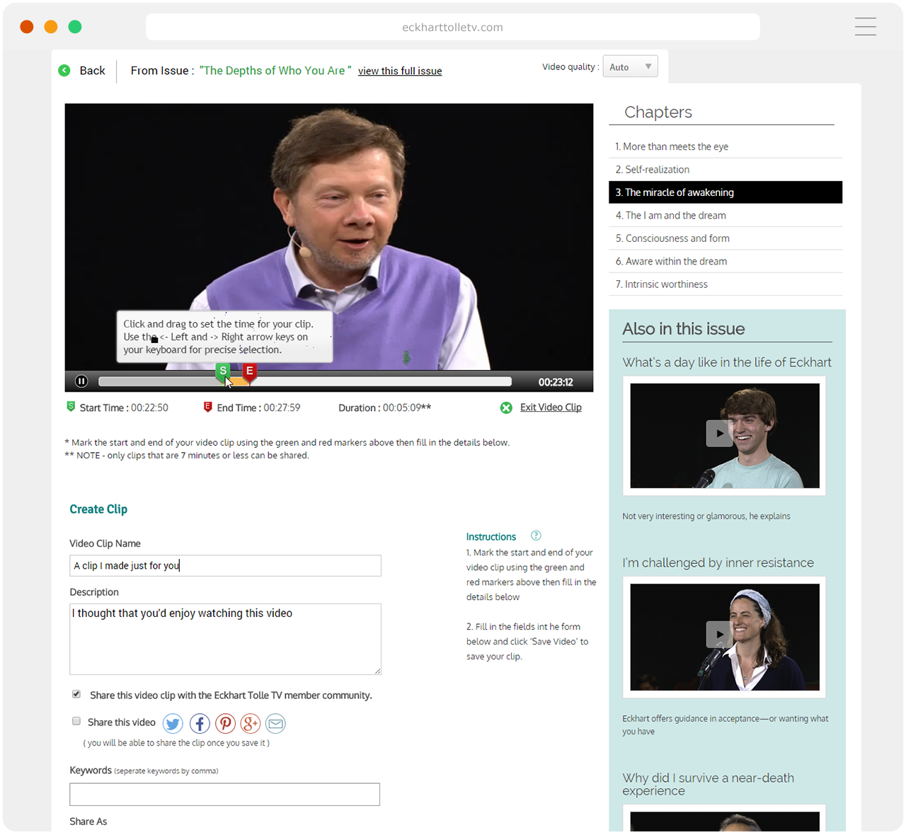 As a feature of a new member website launch, a video clipping and sharing tool was graphically designed and developed for Eckhart Tolle TV members to clip out portions of a long video, up to seven minutes in length, and share them publically on social media.